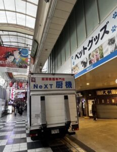 早朝より大阪梅田商店街にて店舗家具一式買取